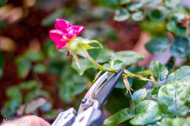 La poda de este momento es una poda muy básica y fácil de hacer y consiste en cortar las flores secas para evitar que se formen escaramujos indeseados y al mismo potenciar la formación de otros nuevos capullos.